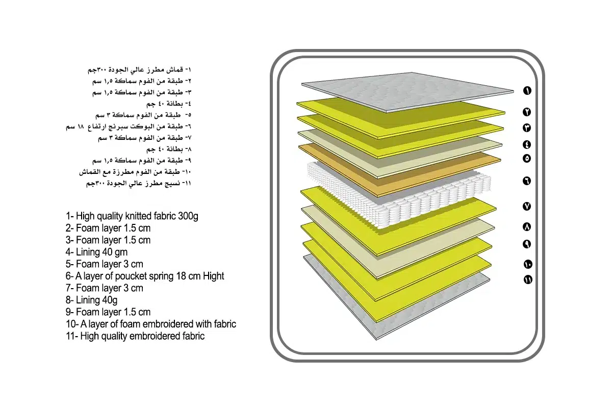 • طبقات المرتبة تم اختيارها بعناية لتلائم وزن الجسم وتمنحه دعم متساوي لكافة المناطق وخاصة العمود الفقري